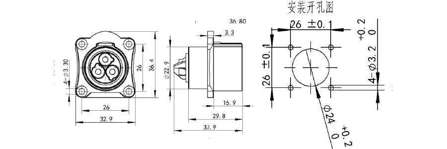 | SL24 / LP24 Штекер с квадратным фланцем | SL24 / LP24 Гнездо с квадратным фланцем |