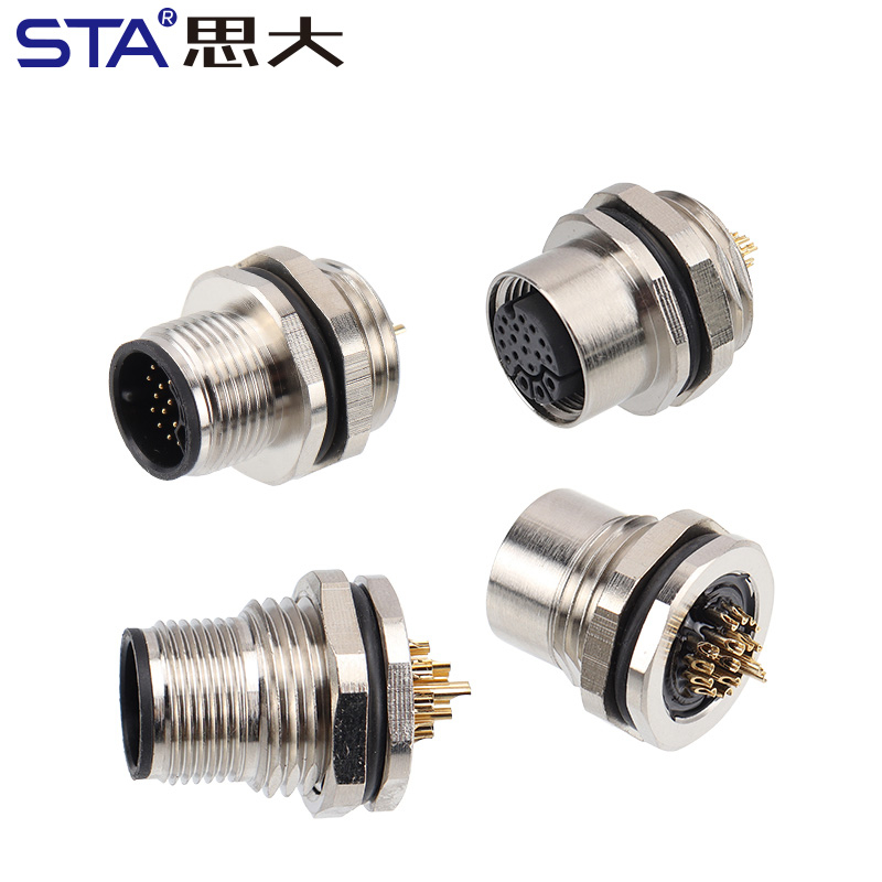 A: Разъём M14 занимает промежуточное положение между M12 и M16, обеспечивая большее количество контактов и более высокую допустимую нагрузку при компактных габаритах, что удобно для плотной компоновки оборудования.