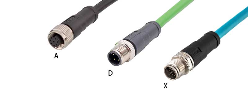 A-code | 4、5、8 иглы | Датчики, исполнительные механизмы, источники постоянного тока | Высокая универсальность, подходит для низкоскоростных сигнальных и контрольных линий |