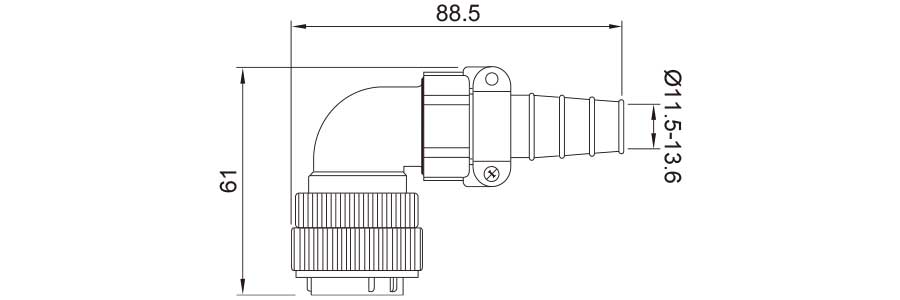 | Угловой штекер с задним корпусом и кабельным зажимом | Угловое гнездо с задним корпусом и кабельным зажимом |